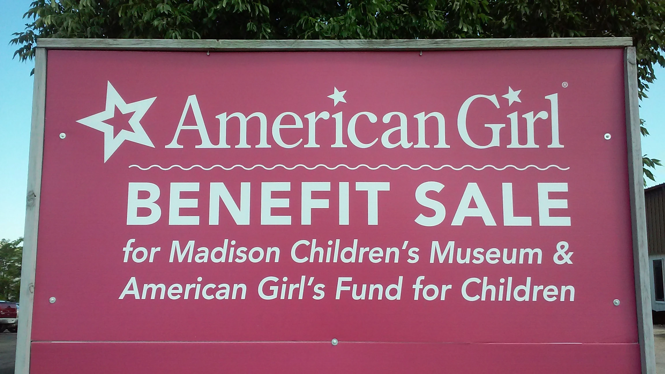 Sign outside of the Middleton, WI location of the American Girl Benefit Sale.