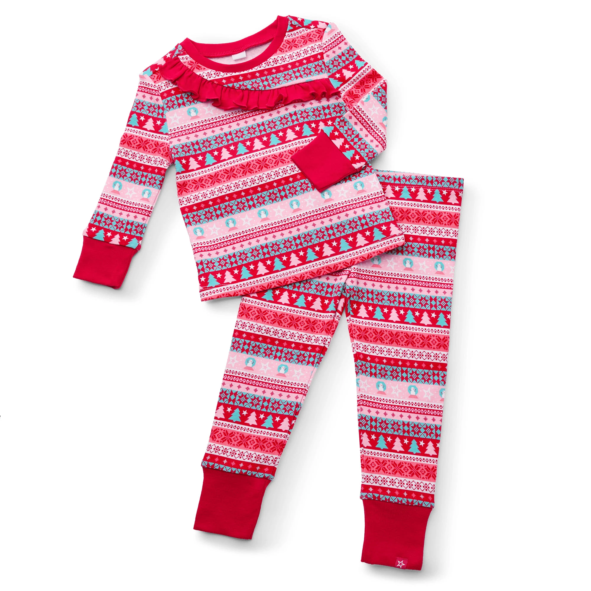 Long cotton pajama pants in a Fair Isle fabric that matches the top. Red cuffs. Red tag on left pant leg with white American Girl star outline.
