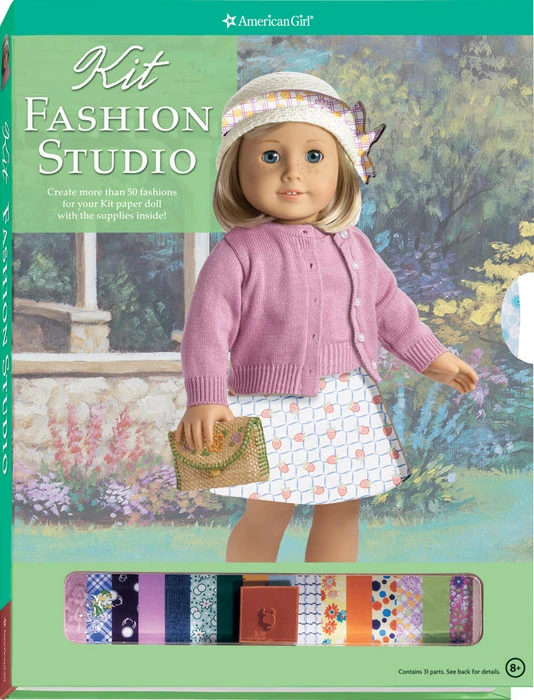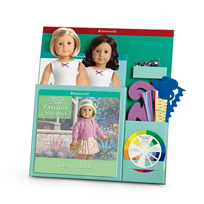 Fashion Studios contained an opening book portfolio with an embedded color wheel. Inside was a design and instruction book, a logo stamp, a paper doll designed to look like the doll in her underclothing and a paper stand, sticky tabs to attach clothing to the paper doll, several pages of stencils, two pages of uncolored stickers for shoes and small trims, and twenty double sided papers for clothes design. (While there is a cover sheet that shows multiple papers, it is not a decor sheet.) A few pages will simulate designs from clothing found in the character's collection (such as Felicity's Meet Dress.)