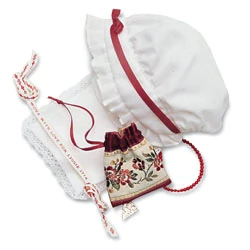 Notably, this is the only set that does not come with a shift (as it was sold separately in Felicity's Undergarments) or any hair ribbon, and is intended to represent more of a overdress gown and visible underpetticoat/skirt.