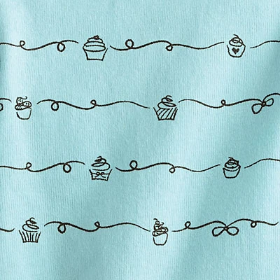 Pale aqua tee. Three-quarter sleeves. Wide neckline. Black print on shirt of ribbons, bows, and various stylized cupcakes. Aqua "Grace/American Girl" patch on right sleeve cuff. Velcros up the back.