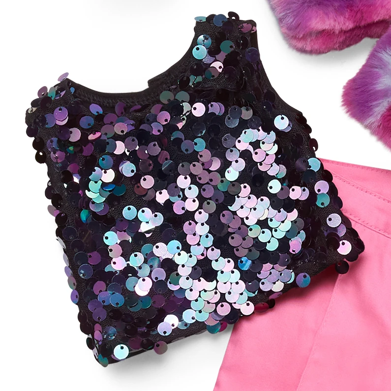 Black sleeveless top decorated with multicolored sequins. Closes in back with velcro.