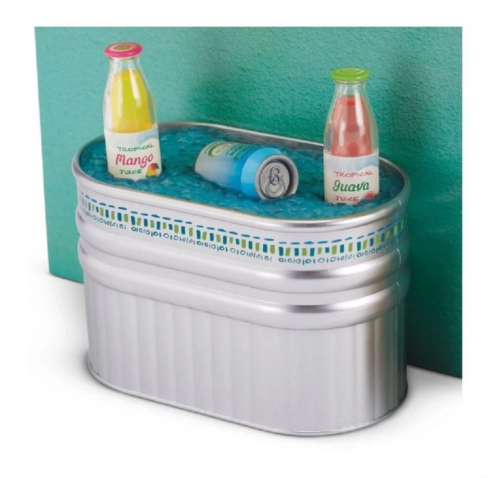 Aqua blue faux-stucco walls with bright salmon pink board-molded inner walls. Large pickup window on one side. Neon yellow counter extending through window and along both walls on the inside, with print on top surface of aqua, green, and blue small square tiles. Neon yellow half-round table with support of same color on outside of solid wall. Mosaic-style wave on tabletop of the same printed tiles as on the counter. Three angled open storage compartments below window; these are joined as a single, neon-yellow shelf unit. Oval shaped grey plastic "metal" drink tub at base of window wall filled with molded blue non-removable ice that has three indentations to hold included drinks. Two neon yellow shutters with salmon pink knobs.