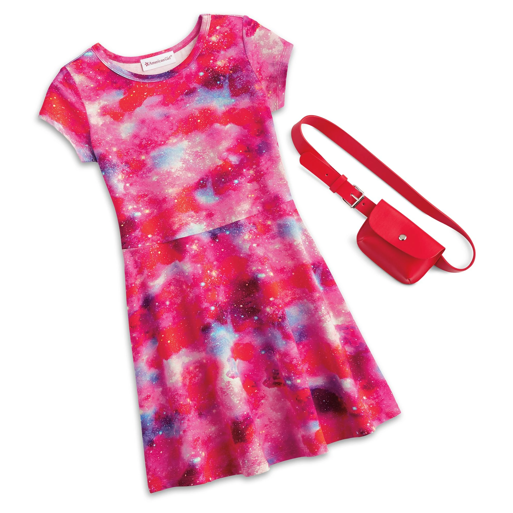Knee length knit galaxy print dress. Slightly open round bound neckline. Cap sleeves. Flared half-circle skirt. Print of "galaxy" print with pink base, and swirls of purple and darker pink clouds with white stars scattered. Velcros up the back. American Girl plastic tag on lower left front hem of skirt.