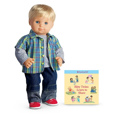 The Plaid and Denim Outfit is a Bitty Twin outfit released in 2008 and the fourth meet outfit for boy Bitty Twins. Retail cost was $24.