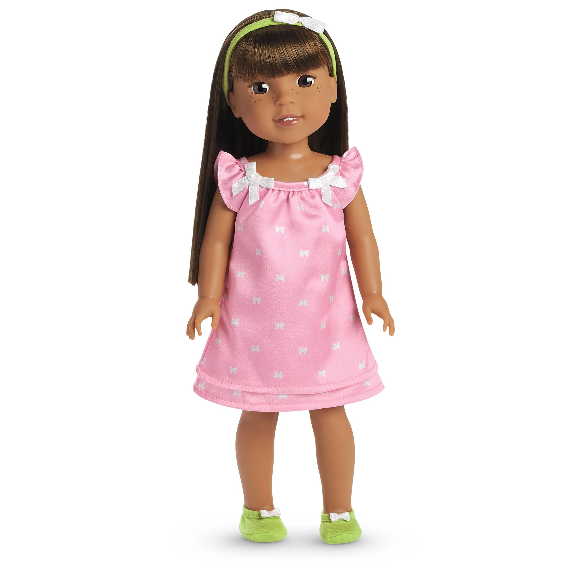 The Ruffles and Bows PJs (also sold as Ashlyn's Ruffles and Bows PJs) is a WellieWishers outfit released in 2017 and retired in 2019. Initially it was not sold directly by American Girl, but it was later available on the site on clearance. Retail cost was $19.99.