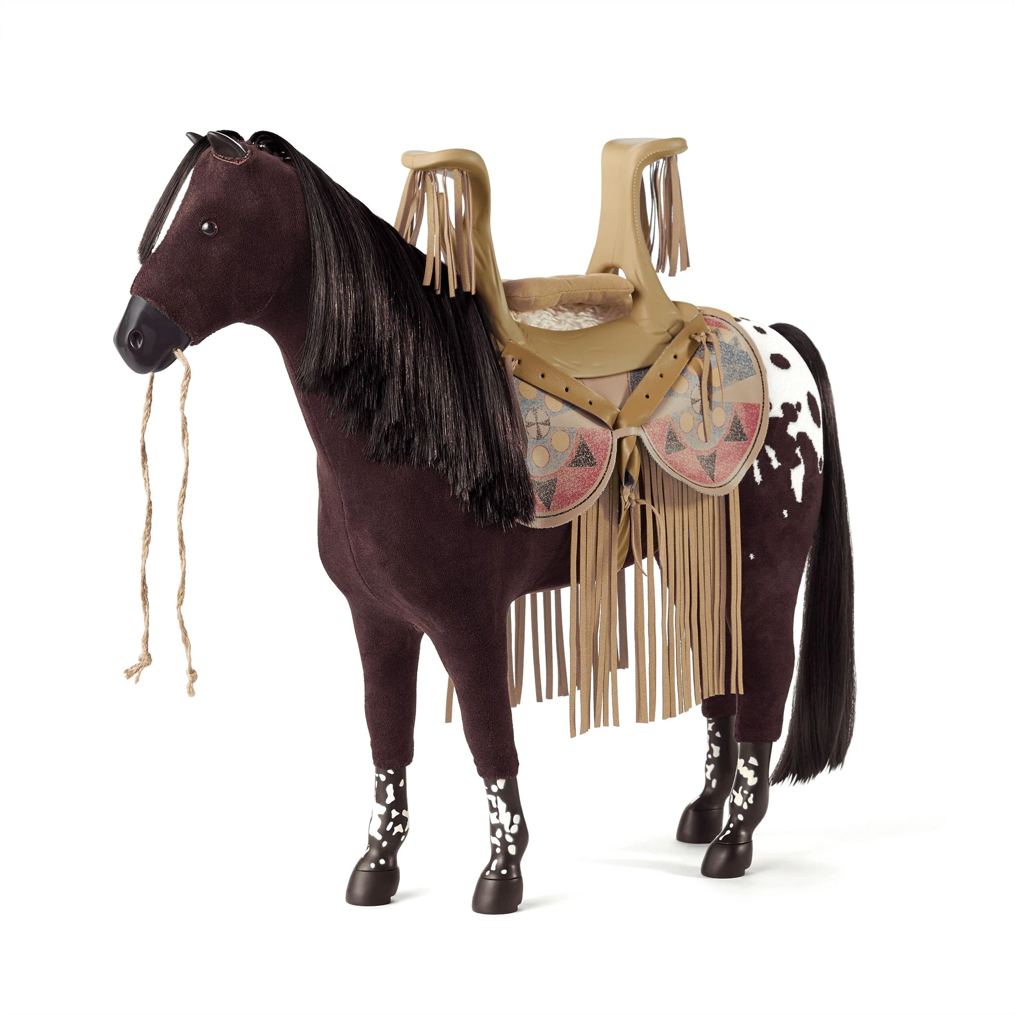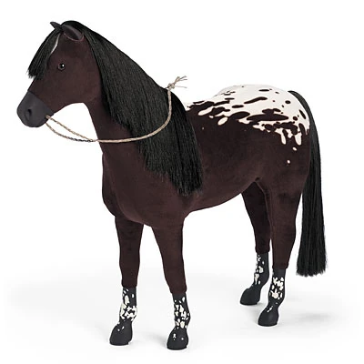 Dark brown Appaloosa mare with spotted rump and hooves. She also has a white star on her forehead. Brown and white "fur" covering with plastic base. Plastic lower legs with white airbrushed spots. Brown eyes. Black mane and tail.